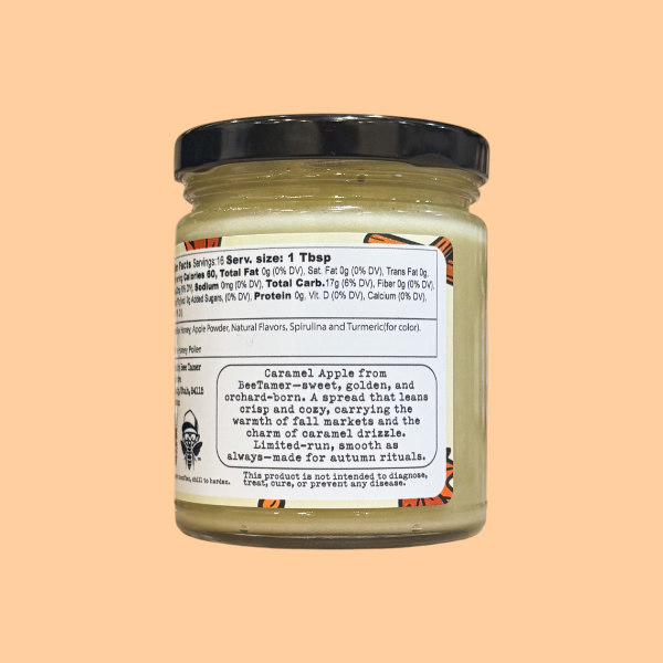 Caramel Apple from BeeTamer—rich, golden, and made for fall. Raw creamed honey stirred with real apple powder and smooth caramel flavor, giving the taste of a crisp orchard apple wrapped in sweet warmth. Limited-run, silky as always—crafted for autumn tables.